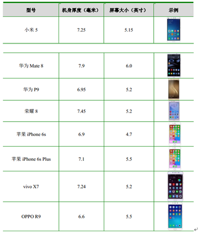 主要智能手機機身厚度和屏幕大小情況如下表所示: