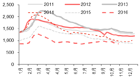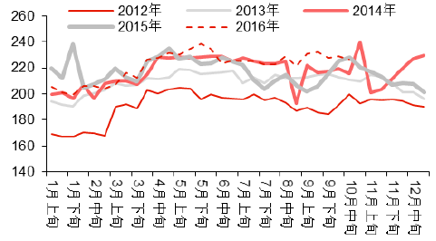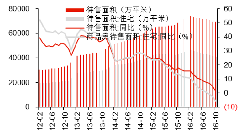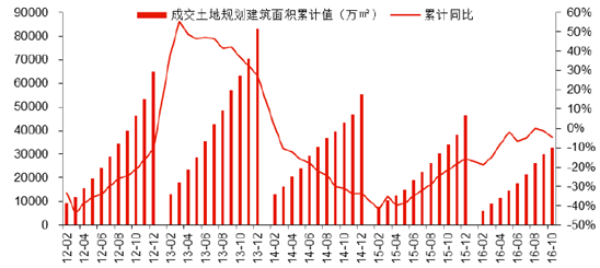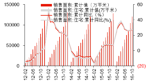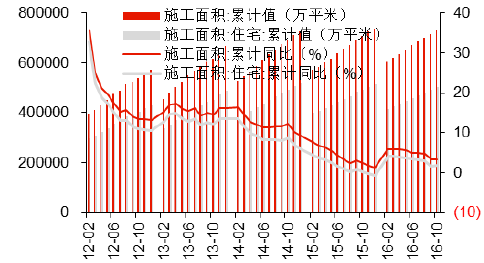 銷售數據向好、開發商補庫存,新開工將維持高位。住宅用地的成交面積在2014 年、2015年分別下降33%、16%,新開工面積在2014 年、2015 年呈現負增長,隨著2015 年下半年以來的銷售加速,開發商需要補庫存。從2015 年9 月開始,商品房新開工累計同比增速開始增長,并于今年年初轉正,2016 年前10 月,商品房新開工累計同比增速達到8%。