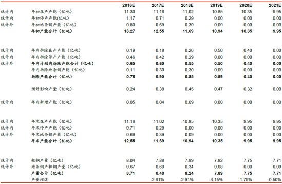 上述現象有以下幾方面原因,一是部分省份較為積極,將2017 年任務提前至2016 年完成,二是將地條鋼產能計算在內,我們推算0.76 億噸煉鋼產能壓減計劃中,地條鋼產能約占15%,約為0.11 億噸。各省及央企上報的產能壓減計劃中,煉鐵、煉鋼有效產能占比分別約為55%、40%,即0.18、0.30 億噸。壓減的0.30 億噸煉鋼有效產能中含0.11 億噸地條鋼產能,因此2016 年全年壓減的統計內煉鋼產能約為0.65 億噸,2017-2020 年仍需壓減煉鋼產能0.35~0.85 億噸,平均每年需壓減0.09~0.21 億噸煉鋼產能。根據我們的測算,截止2016 年底,仍有統計內停產煉鋼產能0.71 億噸以及統計外的地條鋼產能0.69億噸。