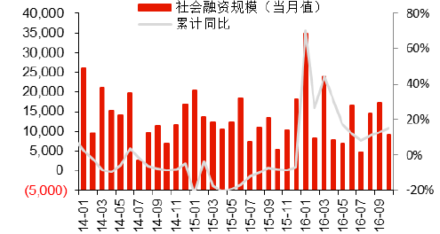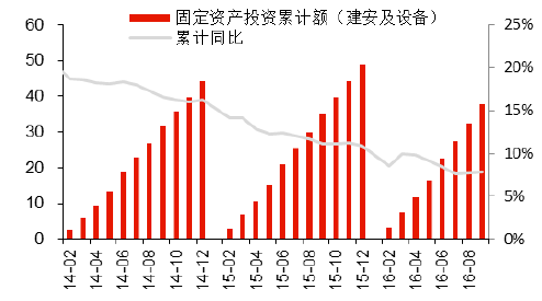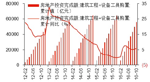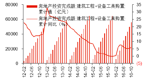 從歷史數據看,商品房銷售和房屋新開工領先房地產開發投資半年到1 年,開發投資從2016 年2 月開始轉正。由于目前經濟仍然處于轉型期,新興產業方興未艾,基建和房地產依然是經濟維穩的重要力量,今年國慶節后的房地產調控主要為打壓房價泡沫、并非抑制銷售,因此房地產商的補庫存和新開工也會繼續。