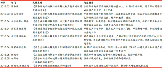 2016 年上半年,去產能政策漸落地。2006 年2 月,國務院發布《關于鋼鐵行業化解過剩產能實現脫困發展的意見》,計劃2016-2020 年去產能1-1.5 億噸。隨后國土資源部、人社部等七部委、國家質檢總局、央行等四部委、國家安監總局、財政部、環保部、國稅總局先后推出8 個配套文件,覆蓋獎補資金、財稅支持、金融支持、職工安置、國土、環保、質量、安全八個方面,其中比較重要的銀行對去產能的支持以及涉及員工安置的1000 億元獎補資金分配方法。