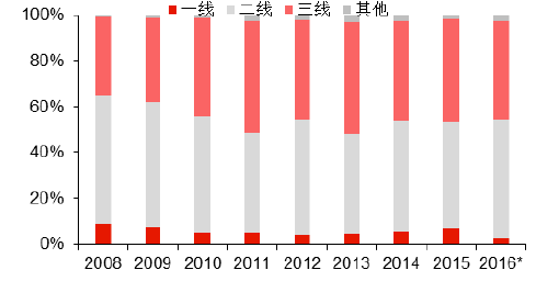 2016 年10 月上旬,國務院印發《推動1 億非戶籍人口在城市落戶方案》,戶籍人口城鎮化率年均提高1 個百分點以上,年均轉戶1300 萬人以上,到2020 年實現戶籍人口城鎮化率提高到50%以上。由于不同規模的城鎮在落戶政策放松程度上有差異,初步判斷該方案將促進三四線城市房地產的庫存去化。