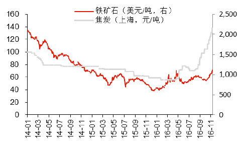 2016 年三季度去產能加速、風險下行,形成板塊買點。今年8 月5 日的鋼鐵煤炭行業化解過剩產能和脫困發展工作部際聯席會議稱,前7 月,鋼鐵、煤炭行業去產能分別完成全年任務的47%、38%,意味著7 月單月鋼鐵煤炭去產能完成全年17%和10%的任務,去產能有超預期跡象。后期,各省上報全年去產能數量,總目標遠超國家設定的0.45 億噸上限,提振市場信心。債務方面,7 月中下旬的鋼企中報預告發布,顯示二季度利潤好轉,政府加強對債務風險的預期管理,如重提“債轉股”、山西省政府為本省煤炭企業債站臺,信用利差下行,板塊買點顯現。從8 月初到11 月中旬,Wind 鋼鐵指數漲幅達19%,超越同期滬深300 指數11 個百分點。