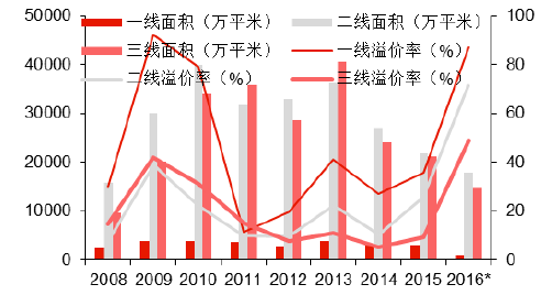 一線、二線、三線城市成交住宅用地規劃建筑面積及溢價率