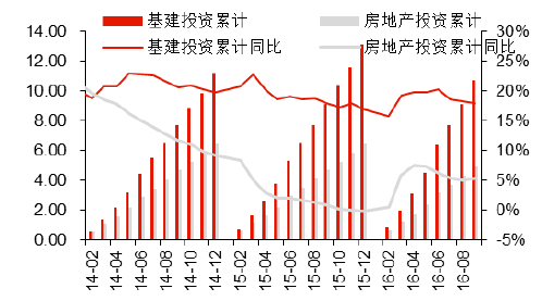 供給有效管控,社融大增,需求端維穩。2016 年前6 月,社融增量達到9.81 萬億,同比增長11.82%;2016 年,社融增量同比增速轉正,實體經濟獲支撐,基建投資及房地產投資表現靚麗。其中,基建投資完成額達到6.38 萬億元,累計同比增長20.33%,繼續保持高增長態勢;房地產投資中的建筑工程和設備工具購置達到3.16 萬億,同比增長6.24%。
