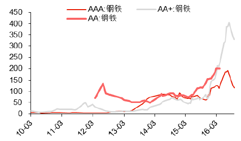 2016 年上半年行業高利潤,市場對供給側改革持謹慎態度。從2015 年11 月政府官員在公開發言中提及供給側改革以來,市場反應平淡;2016 年1 月以來,供給側改革成為高層在公開發言中的高頻詞,市場出現短暫行情,但因匯率風險增強及“熔斷”機制,市場波動較大、震蕩向下。春節以后,數據顯示需求側維穩,鋼價及利潤出現暴漲,帶動板塊向上,然而市場擔憂高利潤推動產能復產,進而利空利潤及去產能,同時鋼鐵信用利差不斷攀高,導致鋼鐵板塊波動較大。上半年,從我們與機構客戶交流的情況看,市場對供給側改革存有疑慮,一是產能去化涉及地方利益,包括GDP 考核、員工安置以及銀行貸款等,二是二季度以來行業利潤好轉,大量停產產能復產,去產能阻力增加。2016 年2 月底,粗鋼產能合計12.4 億噸,其中停產產能為1.71 億噸;3-6 月,在鋼價暴漲、利潤上行的刺激下,約有5400 萬噸停產產能復產。同時,數據顯示上半年鋼鐵去產能僅為1300 萬噸,占總目標的30%左右。
