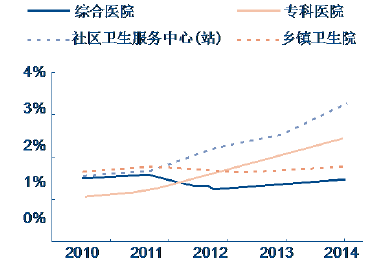 2015年9月國務院辦公廳頒布的《關于推進分級診療制度建設的指導意見》提出,要提升基層醫療衛生機構中醫藥服務能力和醫療康復服務能力,加強中醫藥特色診療區建設,推廣中醫藥綜合服務模式,充分發揮中醫藥在常見病、多發病和慢性病防治中的作用。到2017年,提供中醫藥服務的社區衛生服務中心、鄉鎮衛生院、社區衛生服務站、村衛生室占同類機構之比分別達到100%、100%、85%、70%。但根據衛計委提供的數據,2014年底能夠提供中醫藥服務的社區衛生服務中心、鄉鎮衛生院、社區衛生服務站、村衛生室占同類機構之比僅為83.2%、64.9%、53%和34.4%,缺口分別高達16.7%、35.1%、32%和35.6%,供給的不足正是社會資本進入的巨大機遇。