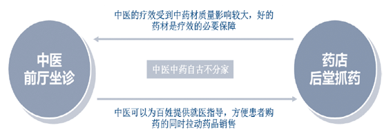 坐堂醫診所指是中醫在藥店、國醫館或其他場所,通過望、聞、問、切的方法為病人做出診斷,并在店里開方抓藥。這種“前廳坐診、后堂抓藥、醫藥一體”的坐堂醫模式,契合了中醫的傳統行醫習慣,使名醫與名藥得以相輔相成,協同作用明顯: