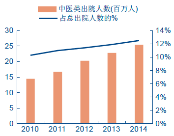 從需求端角度看,2014年我國中醫類醫療機構的就診量達8.74億人次,2010-2014年CAGR達9.3%,占總就診量的比例從2010年的14.7%提高到15.6%;2014年中醫類醫療機構出院人數達2,537萬人,2010-2014年CAGR達15.1%,占總出院人數的比例從10.3%提高到了12.5%。中醫診療量占總就診量和總出院人數的比例上升,體現了中醫診療的需求旺盛、在醫療服務領域的地位不斷提升。