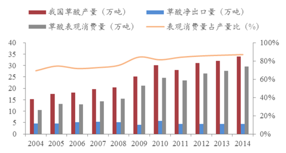 我國是世界最大的草酸生產(chǎn) 國和出口國,2015 年我國共出口草酸 3.93 萬噸,進口僅 123 噸,表觀消費量呈逐年增加態(tài)勢。