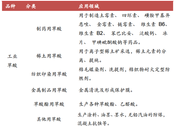 工業(yè)草酸是指達到國家標(biāo)準(zhǔn)(GB/T1626-88)的草酸,目前工業(yè)草酸為草酸行業(yè)的主 要產(chǎn)品,主要應(yīng)用于制藥、稀土、精細化工和紡織印染等行業(yè)。精制草 酸是由工業(yè)草酸精制后生成的高純草酸,產(chǎn)品質(zhì)量高于工業(yè)草酸國家標(biāo) 準(zhǔn)。隨著草酸應(yīng)用領(lǐng)域不斷擴展和深化,下游客戶對草酸純度和品質(zhì)的 要求不斷提高,精制草酸需求快速增長。此外,精細化工行業(yè)的發(fā)展促 進了以工業(yè)草酸和精制草酸為基礎(chǔ)原料的衍生產(chǎn)品相繼被開發(fā)出來,如 草酸鹽、草酸酯等。