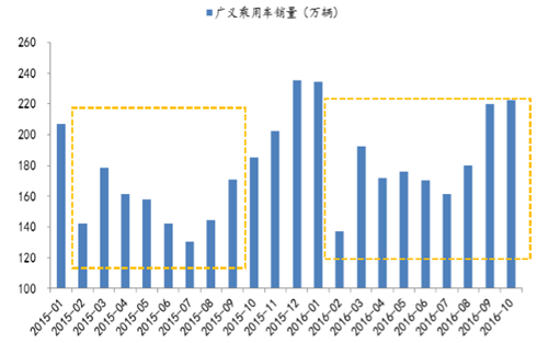 天然橡膠主要應用于汽車輪胎,汽車輪胎的耗膠量占比橡膠需求的近 70%。受到由 2015 年 10 月份開始實施的車輛購置稅減半政策的影響,2016年我國下游輪胎消費回暖。根據全國乘聯會數據,我國2016年 1-10 月廣義乘用車銷量 1867 萬輛,同比增長達 15.2%,輪胎消費需求增 加迅速。加上 11 月 3 日,美國宣布將不再對進口我國的卡客車輪胎征收反補貼稅,有利于中 國對美國輪胎出口的增加,進一步拉動輪胎的消費需求。預計我國天膠庫存在明年春季 或將見底,明年天膠景氣將繼續向上。