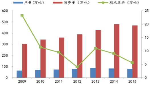我國橡膠產量、銷量、期末庫存(萬噸)