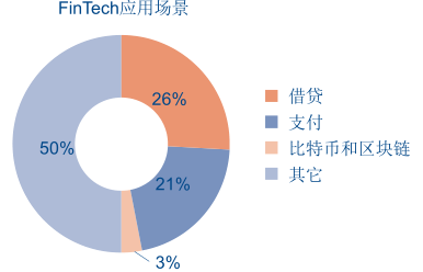 FinTech 所著力解決的問題包括:金融業數據化、大數據智能化、服務低成本化、服務與資產配置多元化及信息安全化。因此,FinTech 未來的使用場景將遍布金融行業的每一個方方面面。當前,FinTech 產業的主要應用場景以較為傳統的借貸和支付為主,區塊鏈等新興技術占比較小。