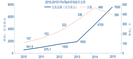 近年來,金融行業與技術核心的人工智能結合引發了一波智能投顧的熱潮。2015 年全球最大資產管理公司貝萊德基金(BlackRock)花費 1.5 億至 2 億美元收購理財初創公司“未來顧問”(FutureAdvisor),為公司機器人理財顧問業務做準備。從 2010 年起,FinTech 領域融資金額的規模和交易宗數不斷攀升,2015 年全球 FinTech 融資額度達到 76 億美元,未來市場規模前景巨大。