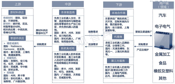 機(jī)器人產(chǎn)業(yè)鏈包括上游核心零部件生產(chǎn),中游機(jī)器人本體制造、系統(tǒng)集成以及下游汽車、電子電氣、金屬加工食品加工等行業(yè)應(yīng)用。