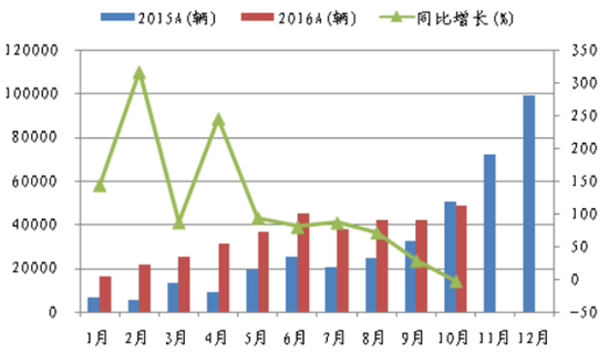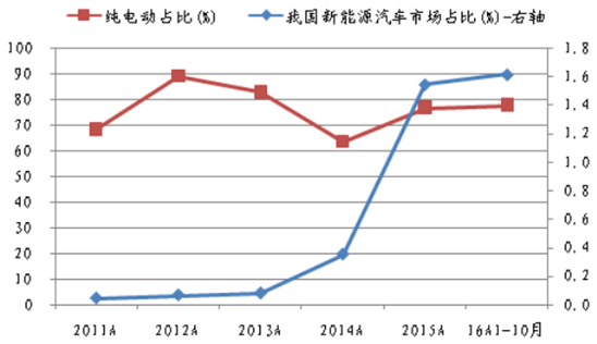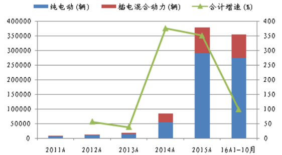 核心提示:2011-2014年,美國新能源汽車產銷量持續穩居全球龍頭,2014年銷量11.87萬輛,同比 增長22.86%,在美國汽車銷量中占比0.72%;2015年銷量11.53萬輛,同比則回落2.88%, 占比也回落至0.64%;16年1-10月2011-2014年,美國新能源汽車產銷量持續穩居全球龍頭,2014年銷量11.87萬輛,同比 增長22.86%,在美國汽車銷量中占比0.72%;2015年銷量11.53萬輛,同比則回落2.88%, 占比也回落至0.64%;16年1-10月實現銷量11.97萬輛,同比增長30.88%,占比提升至0.83%, 創近年來新高。2014年為我國新能源汽車啟動元年,全年產量8.40萬輛,在我國汽車產量中占比0.35%;15年則大幅飆增至37.90萬輛,同比增長351.19%;16年1-10月實現產量35.50 萬輛,同比增長98.10%。我國新能源汽車長期堅持以純電動為主的發展格局,16年1-10 月,純電動合計占比77.75%,且我國新能源汽車市場占比持續大幅提升,2011年占比僅 為0.04%,15年大幅提升至1.55%,16年1-10月持續提升至1.62%。