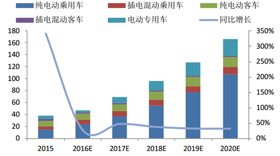 據中汽協統計,2016 年 1~8 月我國新能源汽車生產 25.8 萬輛,銷售 24.5 萬輛,同 比分別增長 111.0%和 115.6%。綜合行業數據及估測值,預計 2016 年全年產銷 規模有望達到 45 萬輛以上,同比增長約 20%。根據我國新能源汽車發展規劃,到 2020 年,我國新能源汽車市場保有量將達到 500 萬輛,5 年具備 10 倍市場規模。
