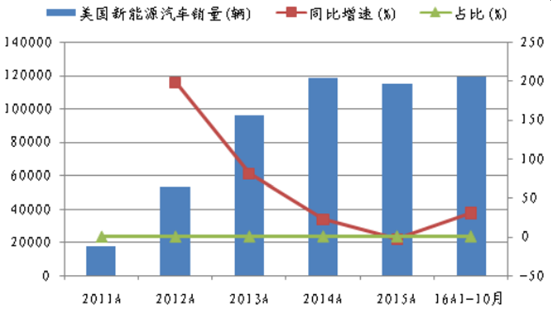 2011-16 年美國新能源汽車產量、增速及占比
