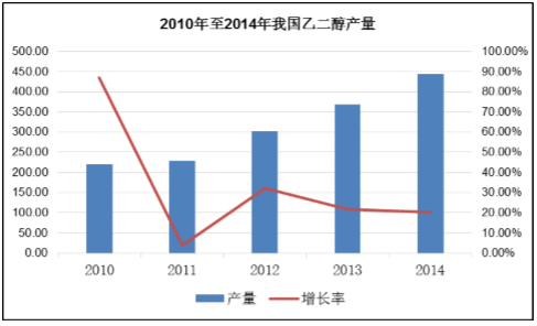 自 2010 年以來(lái),我國(guó)乙二醇產(chǎn)量情況如下: