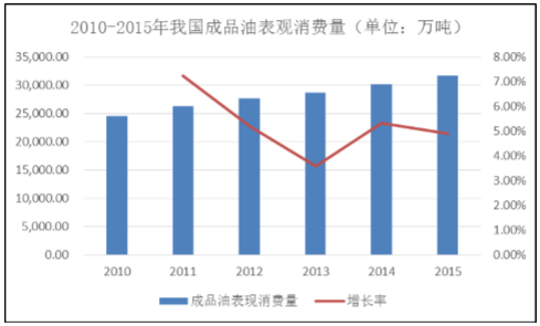 根據(jù)國(guó)家發(fā)改委數(shù)據(jù),2015 年我國(guó)成品油表觀消費(fèi)量 27,616 萬(wàn)噸,較 2014年增長(zhǎng) 1.2%,其中,汽油表觀消費(fèi)量增長(zhǎng) 7.0%,柴油表觀消費(fèi)量下降 3.7%。在我國(guó)經(jīng)濟(jì)繼續(xù)增長(zhǎng)的趨勢(shì)下,成品油未來(lái)還將保持較大的消費(fèi)量。由于成品油的液體屬性,無(wú)論是運(yùn)輸還是存儲(chǔ)都需要專業(yè)、安全的倉(cāng)儲(chǔ)環(huán)境來(lái)保證其順利實(shí)現(xiàn)空間和時(shí)間的流轉(zhuǎn),而 2010 年-2015 年成品油表觀消費(fèi)量的增長(zhǎng)也一定程度上提高了成品油的倉(cāng)儲(chǔ)管理要求和倉(cāng)儲(chǔ)需求。