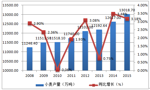據(jù)國家統(tǒng)計局公布數(shù)據(jù),2008-2015年,中國小麥產(chǎn)量保持逐年增長態(tài)勢,增長率在3.5%以下波動。2014年,中國小麥產(chǎn)量達12617萬噸,同比增長3.5%。2015年中國小麥產(chǎn)量達到13018.70萬噸,同比上漲3.18%,產(chǎn)量達歷史新高。