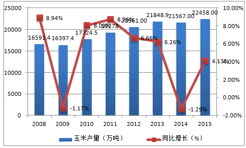 2008-2015年中國玉米產(chǎn)量及增長情況