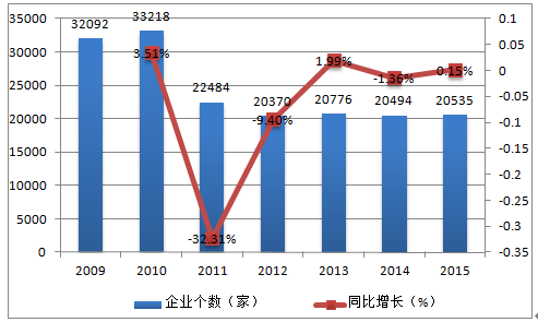 2009-2015年中國紡織業(yè)企業(yè)個數(shù)及變化