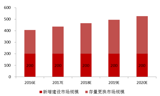 按照每年 2000 萬畝的新增市場計算,假設每畝投資 1000 元,則新增市場空間即可達到 200 億元。假設已建成的高效節水灌溉面積每畝的維護和更換費用每 年在 150 元左右,則存量市場的規模在 200-300 億元,整個節水市場的規模約在 400 億-500 億元。