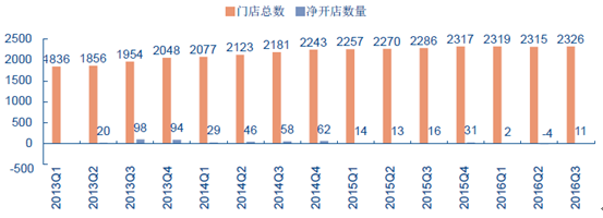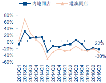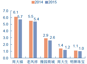 線下渠道紅利期已過,龍頭展店放緩,著眼內部優化與渠道控制力。2016Q1-Q3周大福凈增門店+9家,2016H老鳳祥/豫園商城凈增門店+22/-33家,展店放緩甚至出現凈關店。隨線下渠道趨于飽和,龍頭自渠道擴張走向優化調整,周大福2016財年同時新增/關閉門店46/45家。老鳳祥河南合資公司模式向山東、重慶、湖北(武漢)等區域推廣,周大福推行加盟商統一存貨擁有權管理,增強渠道控制力。