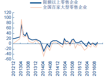 2017年低基數、流動性溢出效應或推動金銀珠寶銷售增速轉正。2016年國慶節期間,各地房地產調控政策出臺,流動性向大宗商品等市場溢出,或對終端黃金飾品銷售產生刺激效應;疊加低基數效應,2017年金銀珠寶銷售增速或有望轉正。