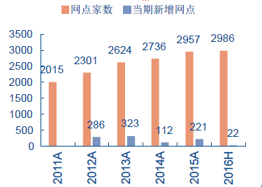 2009-2016年豫園商城老廟黃金、亞一金店網點數