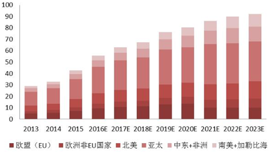 全球市場(chǎng)上GNSS設(shè)備數(shù)量增長(zhǎng)最快的是亞太地區(qū),預(yù)計(jì)從2014年的17億部增長(zhǎng)到2023年的42億部,年均符合增長(zhǎng)率為11%,屆時(shí)將超過歐盟和北美的總和。