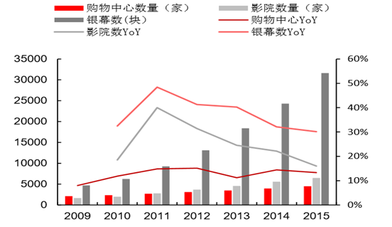 2016 年 1-9 月全國影院達到 7400 家,銀幕 3.76 萬塊。由于票房與銀幕建設之間相互促進,近年銀幕 在票房增長的刺激下保持高速擴張,2010-2015 年銀幕數 CAGR 為 38%。受益于購物中 心建設及縣級影院擴張的帶動,以及票房持續增長對銀幕建設的推動力,預計 2017 年銀幕增速達到 22%。中長期銀幕增長較 2015 年仍有 1-2 倍上探空間,中性情形 下我國銀幕的保有量約為 8 萬塊。