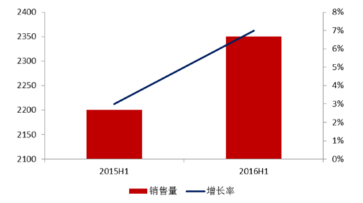 2016 上半年彩電內銷量增長圖 (萬臺)