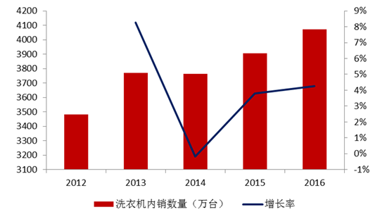 數據顯示,2016 年上半年洗衣機總銷量 2,749.73 萬臺,同比增 長 3.82%。其中內銷銷量 1,899.82 萬臺,同比增長 4.34%;外銷銷量 849.91 萬臺, 同比增長 2.67%。產業在線預計2016年內銷量達到 4071 萬臺,同比增長 4.2%。洗衣 機市場的增長主要是由于產品轉型升級的帶動,滾筒洗衣機價格的低廉化推動了滾筒 洗衣機大規模的替代,健康洗、變頻等也為洗衣機的增長帶來發展空間。
