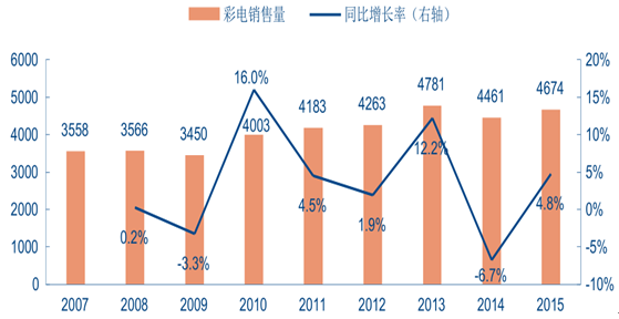 2007-2015 年電視零售量規模增長情況(單位:萬臺)