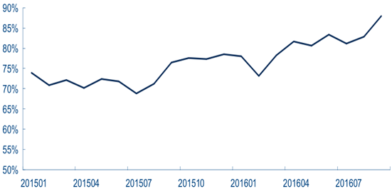 2016年,互聯網電視占電視機零售比重接近 90% ,行業正式進入存量競爭時代。2013年,隨著樂視、小米相繼進入電視行業,互聯網電視這一產品形態開始出現,傳統品牌也陸續推出自己的互聯網電視系列。2014-15 年,互聯網電視全面放量銷售,滲透率不斷攀升。進入2016年,1-8月互聯網電視占電視整體零售的比重已經達到80%,9月甚至達到了88%。可以說,除了少量銷往偏遠地區、企業或酒店等公共場所的電視外,目前市場正在銷售的電視已基本全部是互聯網電視,增量市場的普及已經完成。