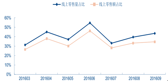 2016 年線上銷量/銷售額占比