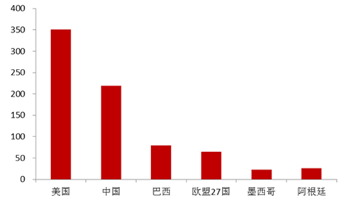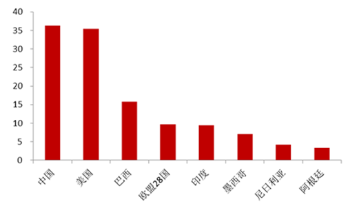 從全球分布來看,2015 年,中國是世界上玉米種植面積最大的國家,但是從產 量上來看,美國則居世界第一,產量達到 3.51 億噸,占全球產量的比重達到 35.43%, 中國產量達到 2.18 億噸,占全球產量比例達到 22.04%。可見,全球玉米產量的集中 度較高,美國和中國兩個國家產量就占到了 57.5%的比重,如果加上第三大玉米生產 國巴西,則占比達到 65.5%。