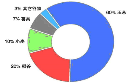 玉米的用途主要有三類:飼料、工業消費和食用。玉米富含多種牲畜、家禽生長必須的營養物質,是最重要的飼料原糧。多年來, 玉米作為飼料原糧進行消費一直占總產量的 60%上下。玉米在雞的配合飼料中,用 量高達 50%-70%。在豬料及其他飼料中所占的比例相對較少。