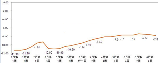 2016年1-6月羊肉價格同比增長率走勢圖