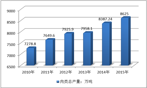 2010-2015年全國肉類總產量