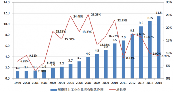 隨著我國(guó)經(jīng)濟(jì)增長(zhǎng)放緩、經(jīng)濟(jì)結(jié)構(gòu)調(diào)整,我國(guó)工業(yè)企業(yè)的應(yīng)收賬款凈額規(guī)模持續(xù)擴(kuò)大。截至 2015 年末,國(guó)內(nèi)規(guī)模以上的工業(yè)企業(yè)應(yīng)收賬款凈額達(dá)到 11.5 萬(wàn)億元。