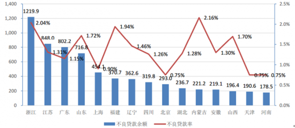 由于我國(guó)各地區(qū)經(jīng)濟(jì)發(fā)展水平不平衡,導(dǎo)致金融資產(chǎn)規(guī)模和不良資產(chǎn)規(guī)模相差較大。根據(jù)銀監(jiān)會(huì)公布數(shù)據(jù),截至 2014 年底,從各省市不良貸款余額情況看,處于經(jīng)濟(jì)發(fā)達(dá)地區(qū)的浙江、江蘇、廣東三個(gè)地區(qū)位列前三位,其中浙江不良貸款余額達(dá) 1,219.9 億元。