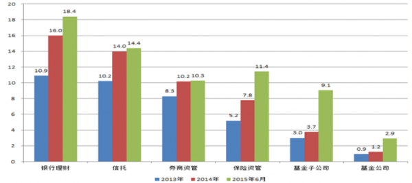 非銀金融大資管發(fā)展時(shí)代,帶來(lái)資管規(guī)模的迅速擴(kuò)張。截至 2015 年 6 月,包括信托、券商資管、公募基金等在內(nèi)的資產(chǎn)管理規(guī)模已經(jīng)超過(guò) 47.0 萬(wàn)億元,較年初增長(zhǎng) 29.1%,其中信托 14.4 萬(wàn)億、券商資管 10.3 萬(wàn)億、保險(xiǎn)資管 11.4 萬(wàn)億、基金子公司 9.1 萬(wàn)億及基金公司 2.9 萬(wàn)億。
