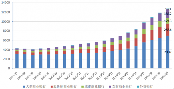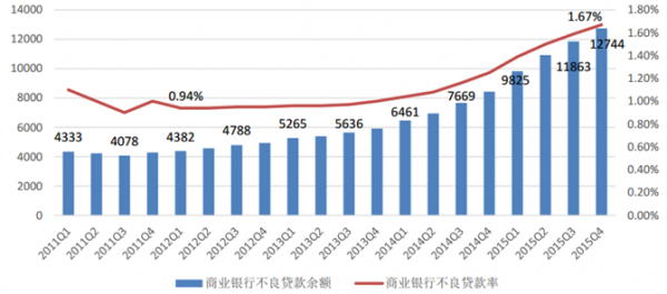 截至 2015 年末,銀行業(yè)金融機(jī)構(gòu)總資產(chǎn) 199.35 萬(wàn)億元,同比增長(zhǎng) 15.67%,其中商業(yè)銀行總資產(chǎn) 155.83 萬(wàn)億元,同比增 15.60%,經(jīng)濟(jì)下行及貸款總量的持續(xù)增長(zhǎng),使得不良貸款率也迅速上升。