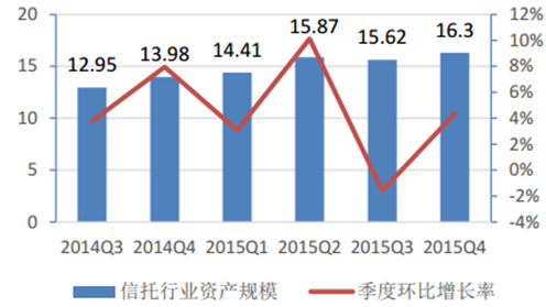 信托行業(yè)資產(chǎn)規(guī)模(萬(wàn)億,%)