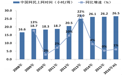 2014 年以來網民上網時間增長幾乎停滯。2014 年-2016 年 H1 網民上網時間同比增速分別為 4%,0%和 1%。從增速來看,網民上網時間目 前已經接近飽和,在上網時間層面難以有較高的增量部分。
