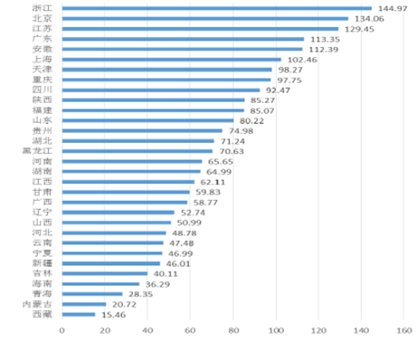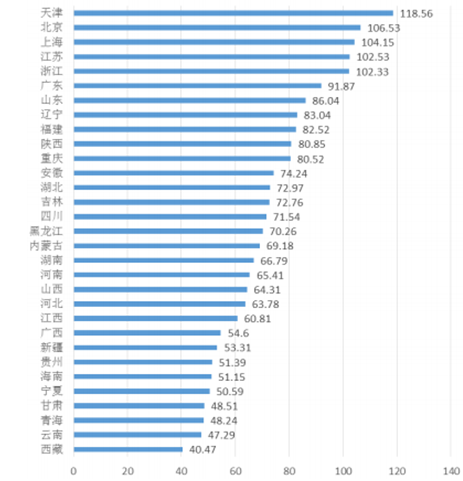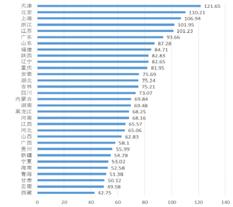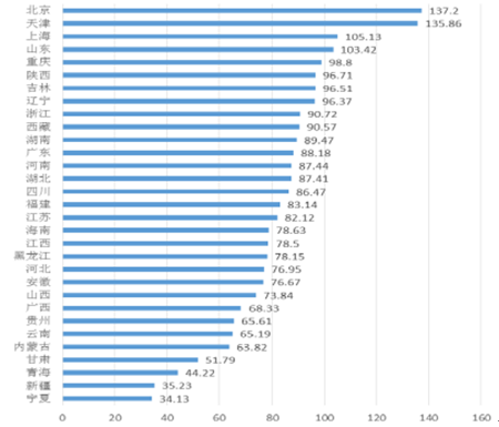 2015 年全國技術創新指數為 72.19,各省市技術創新指數情況如下圖所示。